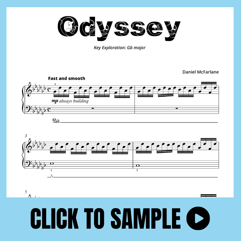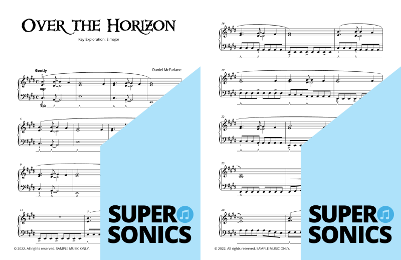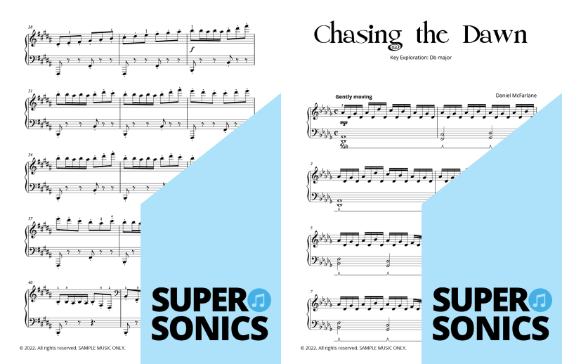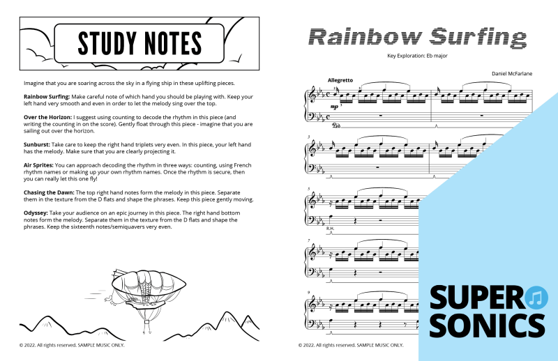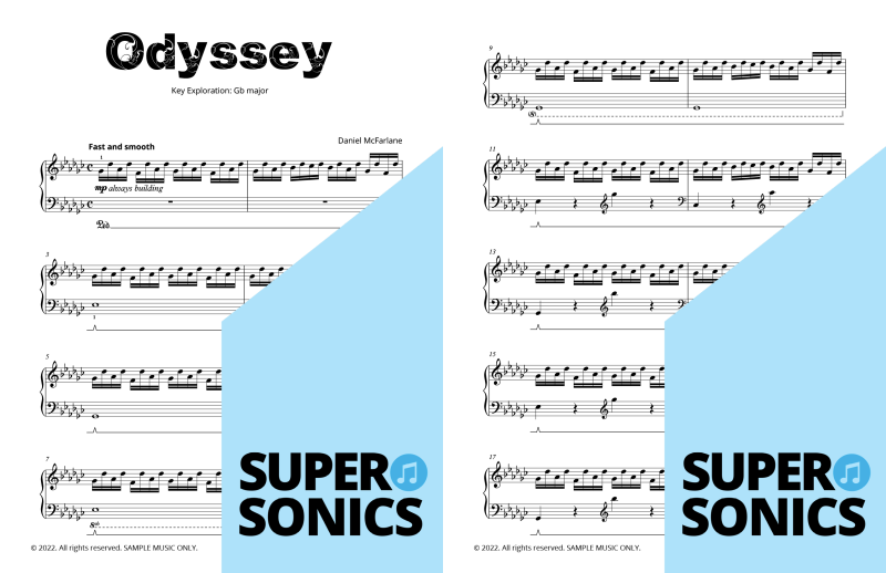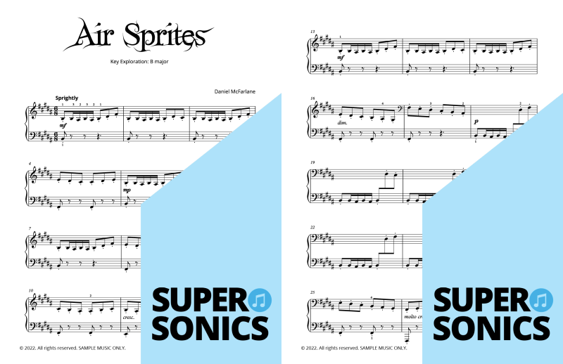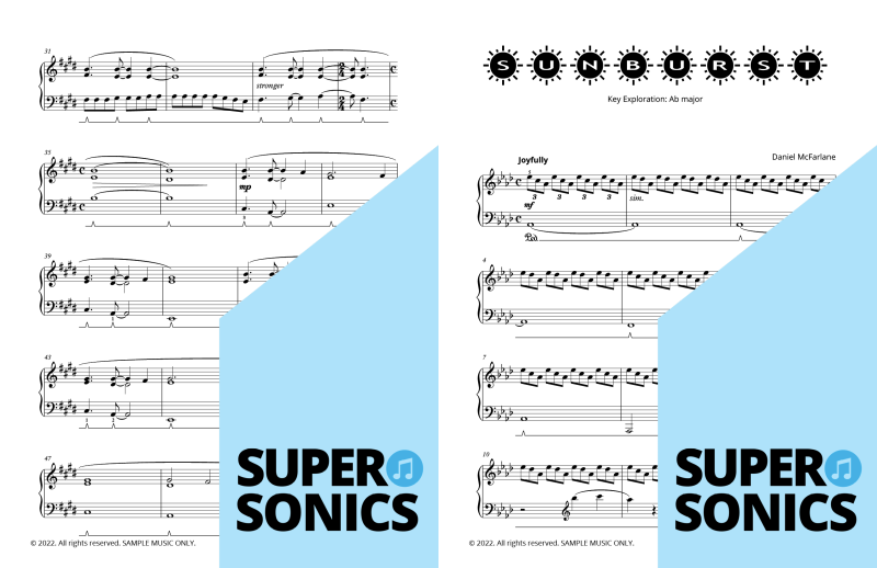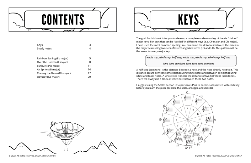 Soar through an adventurous set of pieces that explores six of the trickier major keys. Perfect for students expanding their key knowledge, this collection develops fluency, confidence, and expressive control in less familiar tonal landscapes. Supersonics Pro members can also access each piece transposed into every other major key—ideal for reinforcing key awareness, improving reading, and building technical flexibility.