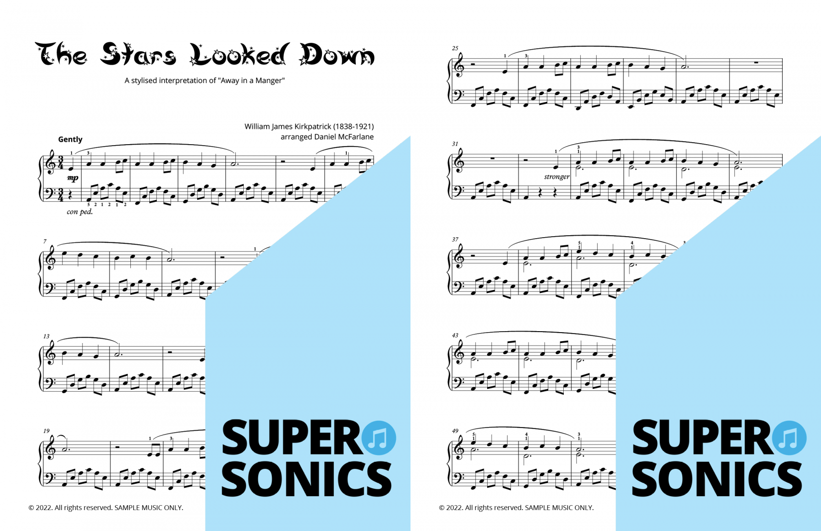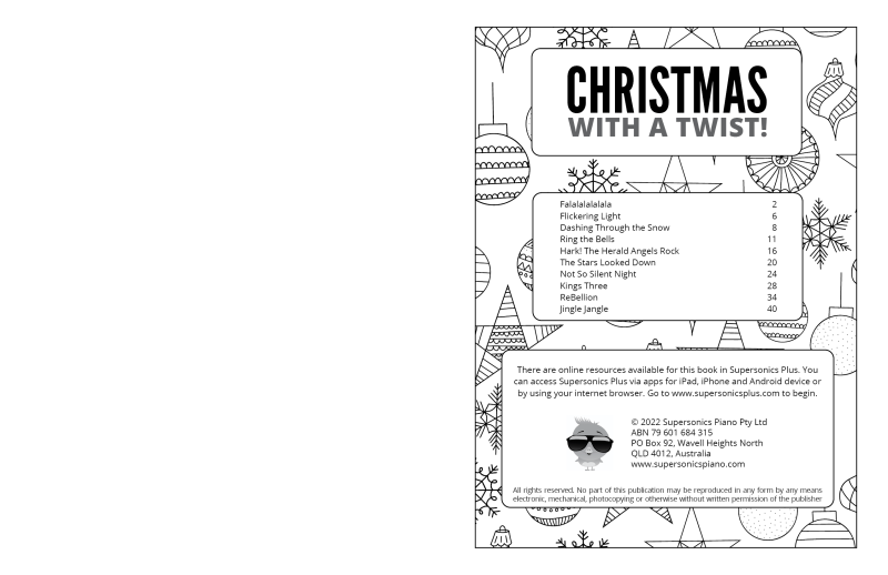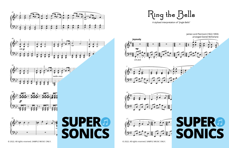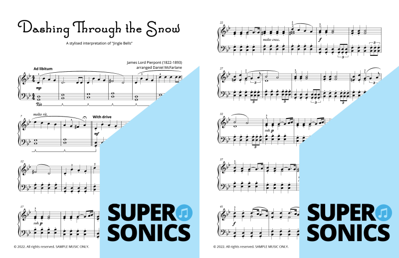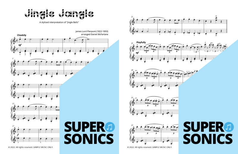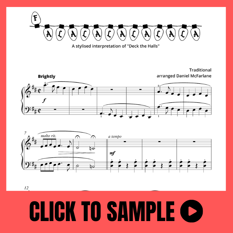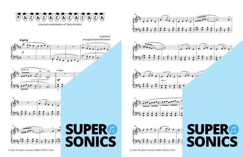 Daniel McFarlane has given ten Christmas carols the “Supersonics” treatment. These playful early Intermediate to Advanced arrangements are loads of fun to play and teach. They also make superb concert pieces! This book features: