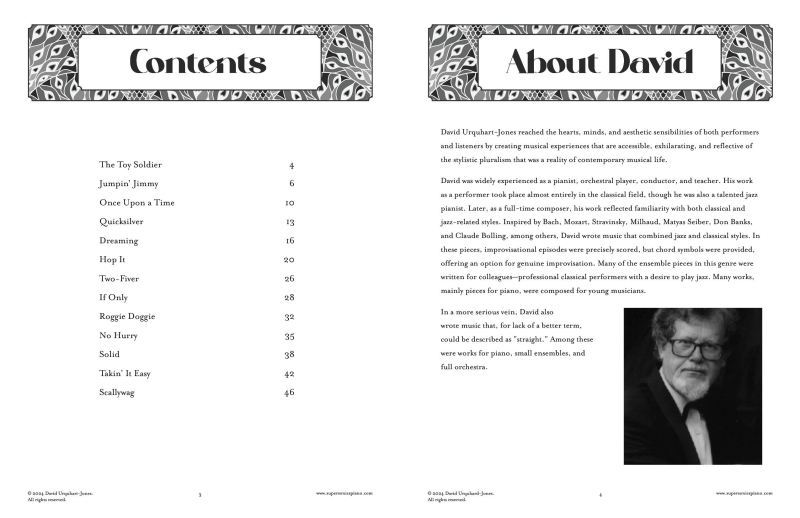 The thirteen pieces in this collection represent what I feel to be David Urquhart-Jones’ greatest solos. Urquhart-Jones reached performers and listeners alike with music that was accessible, exhilarating, and reflective of contemporary musical pluralism. With extensive experience as a pianist, orchestral player, conductor, and teacher, he was grounded in the classical field yet also a talented jazz pianist. As a full-time composer, David drew inspiration from Bach, Mozart, Stravinsky, Milhaud, and others, creating works that fused classical and jazz styles. His compositions featured precisely scored improvisational episodes with optional chord symbols for true improvisation, often crafted for professional classical musicians who enjoyed jazz. David also composed serious, “straight” works, including pieces for piano, small ensembles, and orchestra, as well as pieces for young musicians.