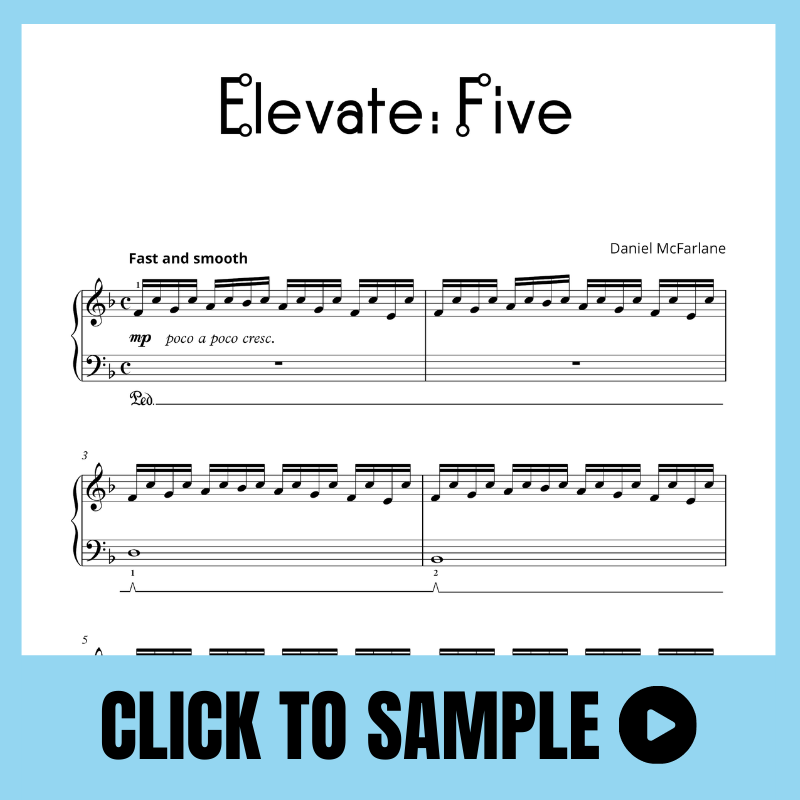 Elevate Studies is all about turning technique into music. These eight uplifting studies explore C, F, and G major with engaging, repeatable patterns that teach the “Robot Rotate” motion — a smooth wrist and forearm rotation that replaces tense, finger-only playing with fluid, expressive sound.