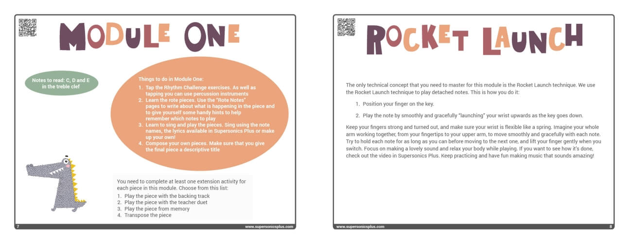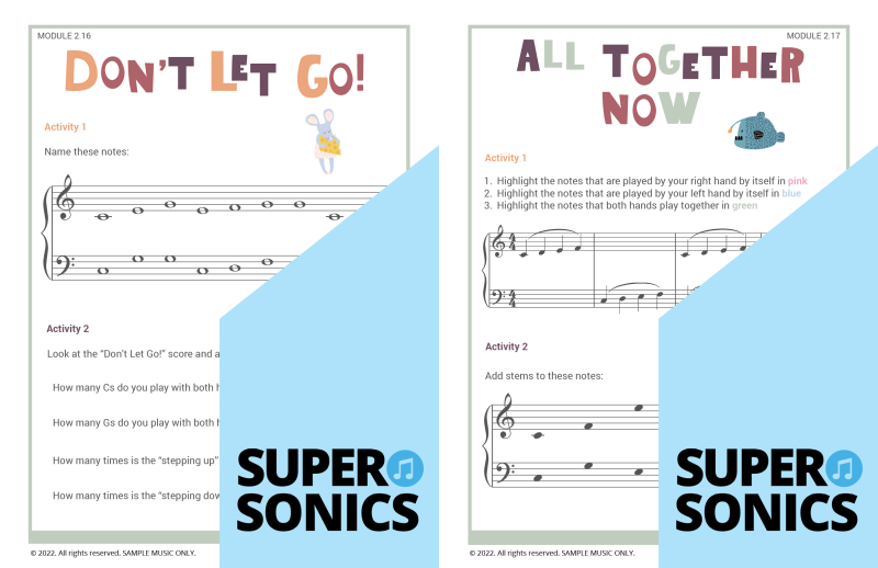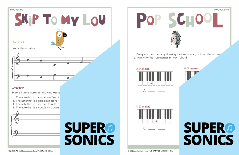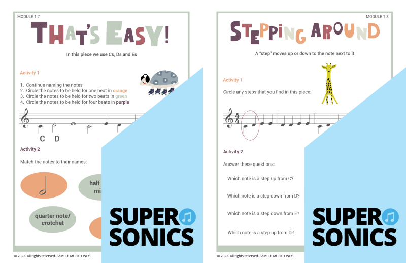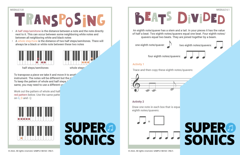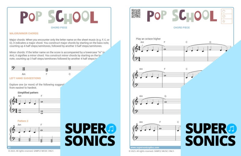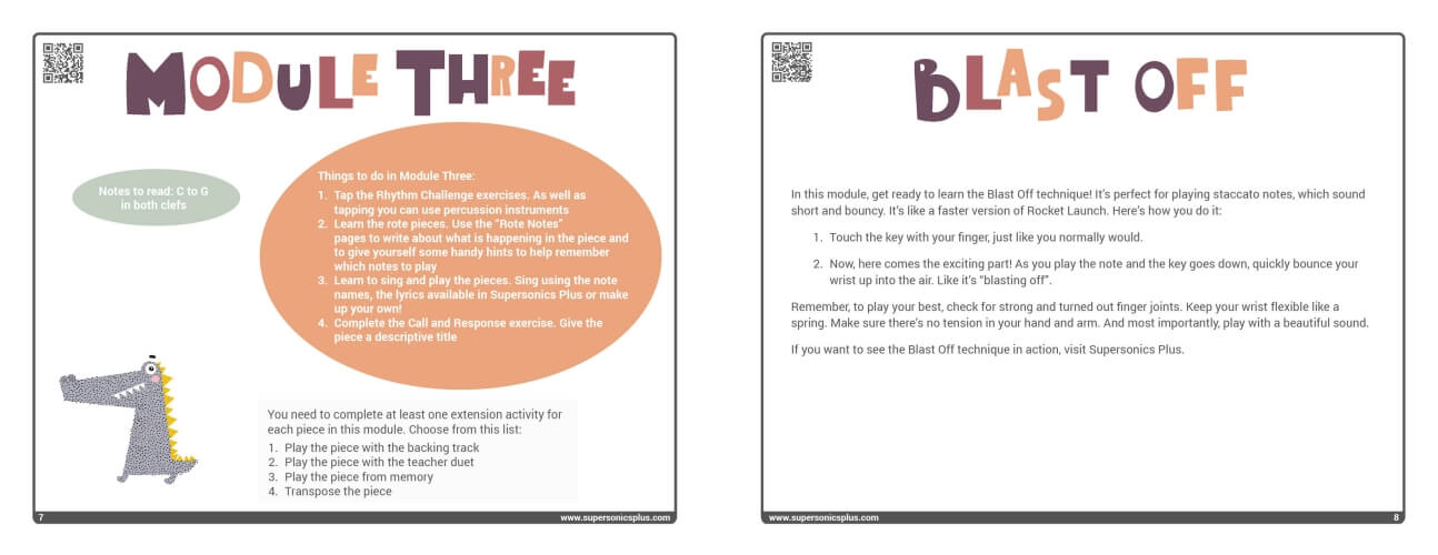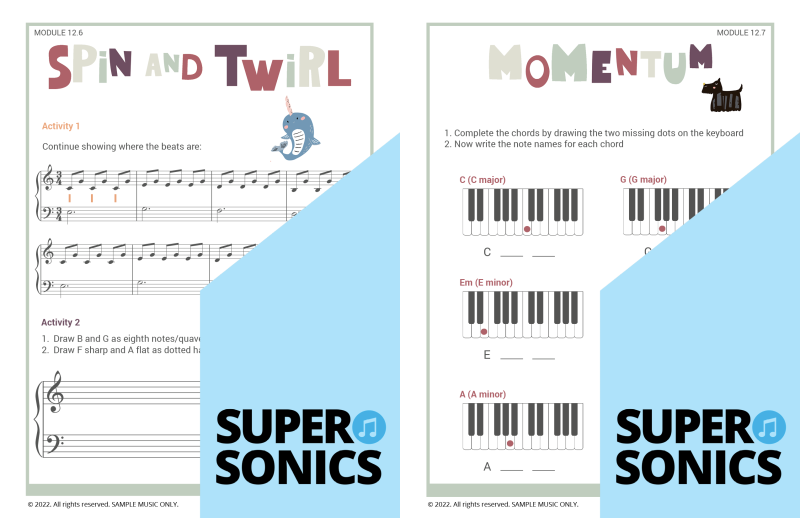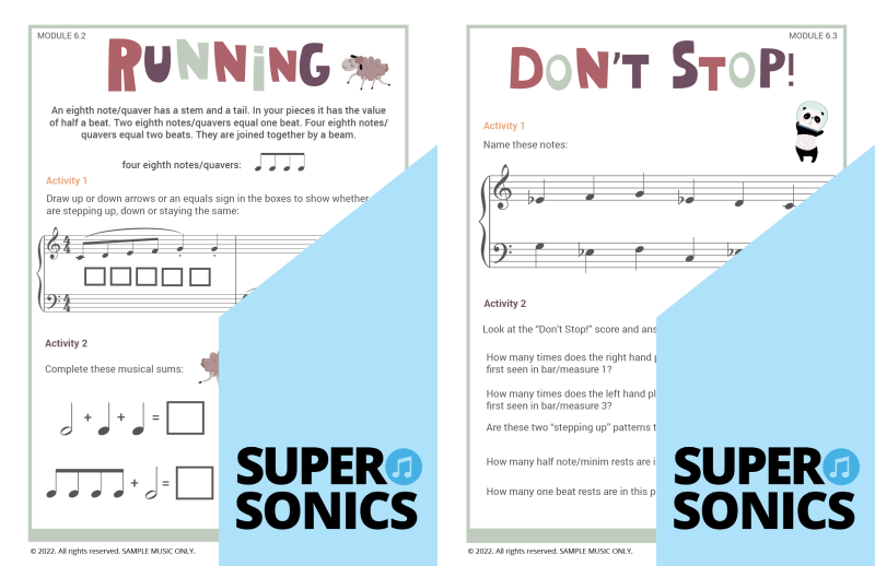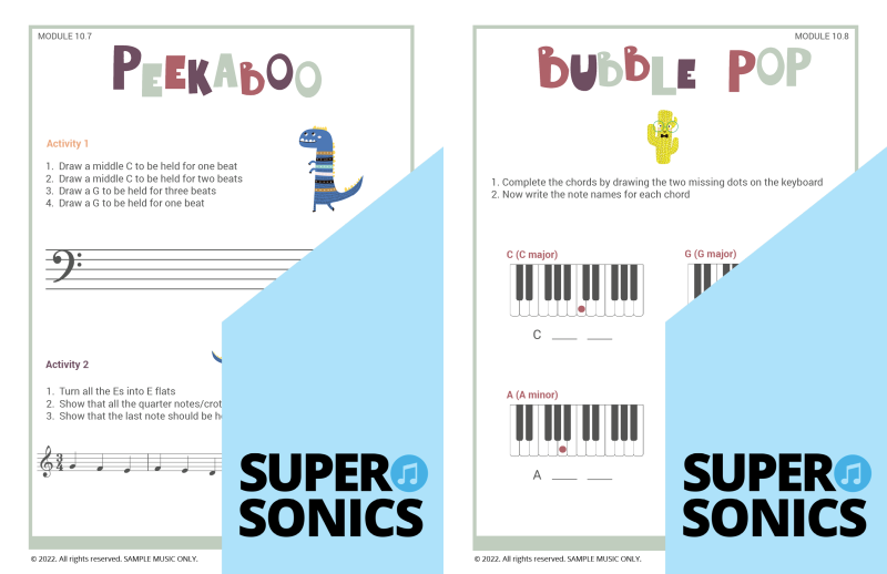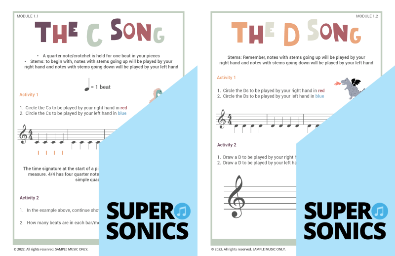 Level 1C concludes the series by covering the remaining modules of Level 1. Here, students are introduced to eighth notes/quavers, dotted rhythms, and pop chords.
