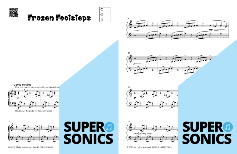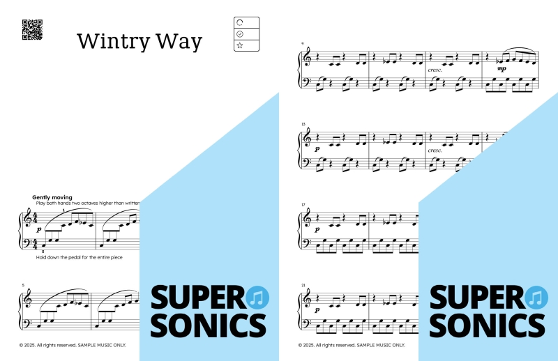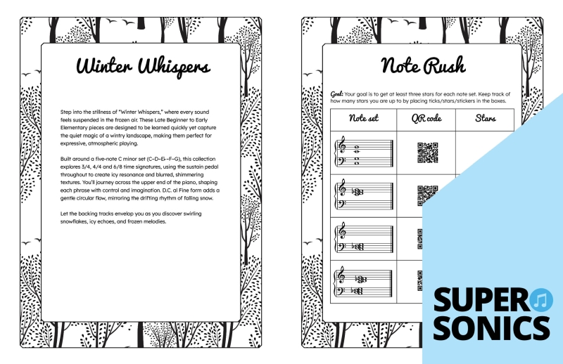 Step into the frozen soundscape of “Winter Whispers”, where stillness and motion intertwine. These Late Beginner to Early Elementary pieces are designed for quick learning yet evoke a haunting beauty — perfect for expressive quick studies and atmospheric performances.