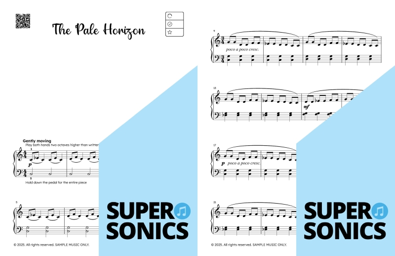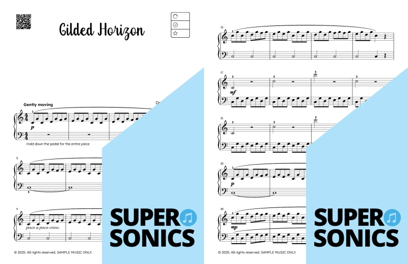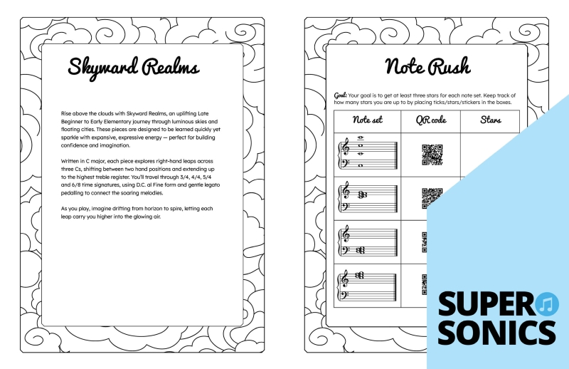 Take flight in “Skyward Realms”, where bright harmonies and soaring melodies reach high above the keyboard. These Late Beginner to Early Elementary pieces capture the exhilaration of rising air currents and wind-filled motion.