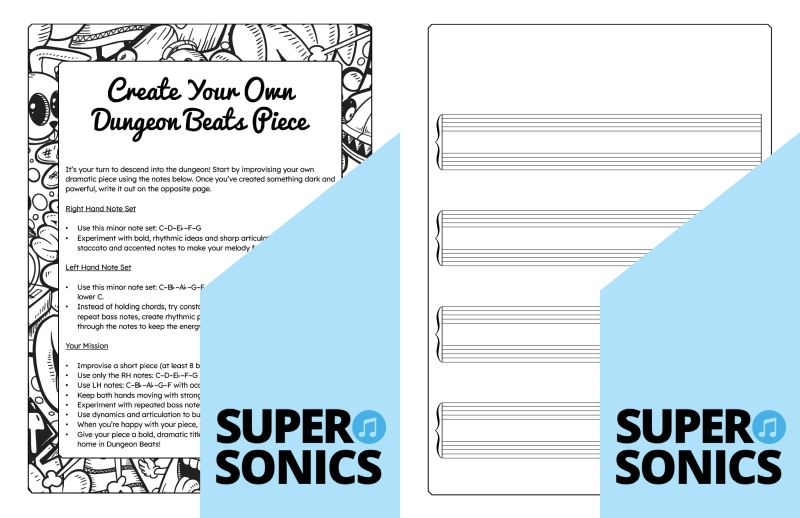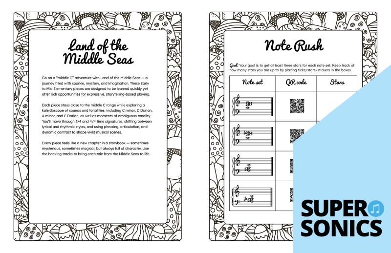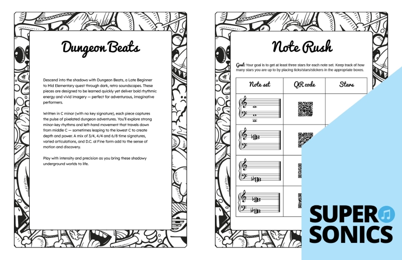 Descend into “Dungeon Beats”, a rhythmic realm pulsing with energy and drive. These Late Beginner to Mid Elementary studies are grounded in groove and repetition, making them both exciting and satisfying to play.