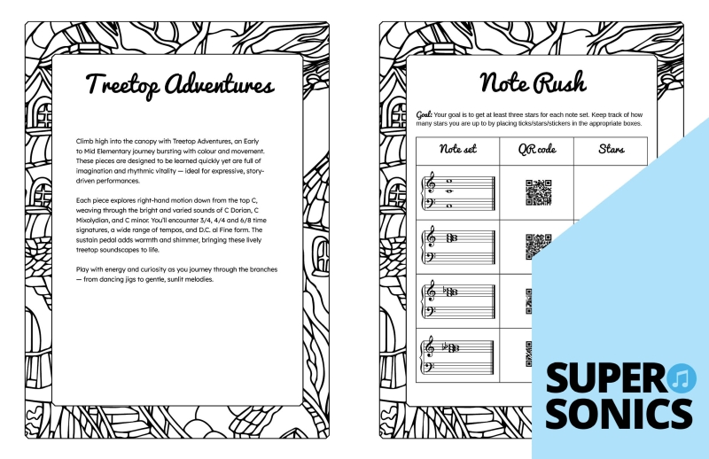 Climb high into “Treetop Adventures”, where rhythm and motion sway like branches in the wind. These Early to Mid Elementary pieces sparkle with energy, combining quick reflexes and light touch for joyful, kinetic playing.