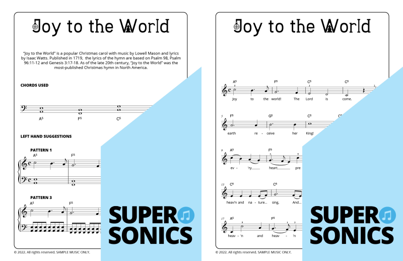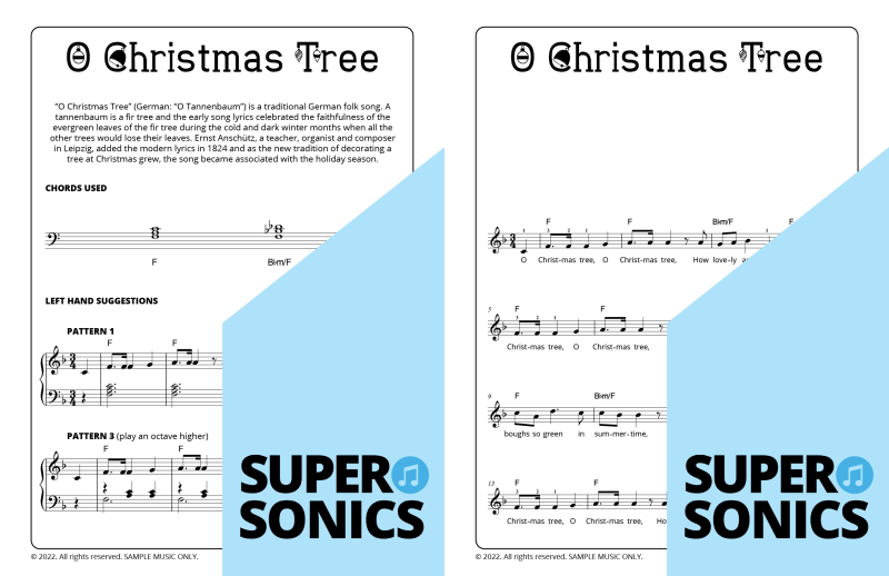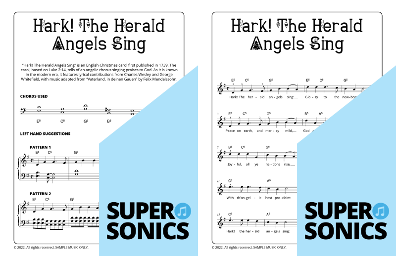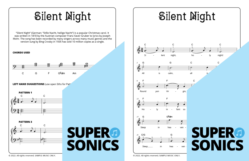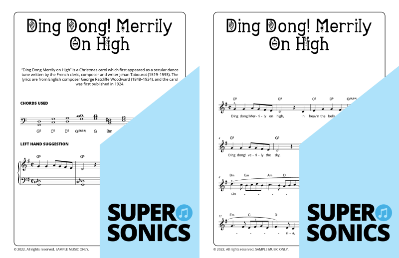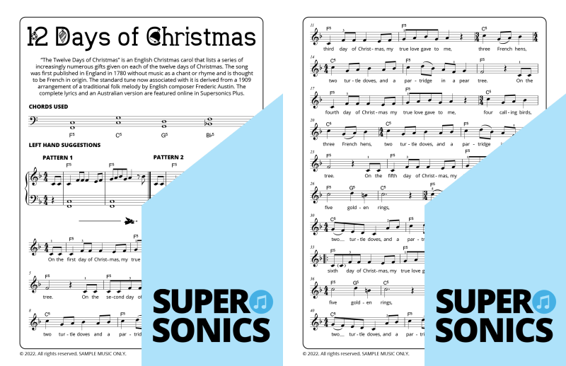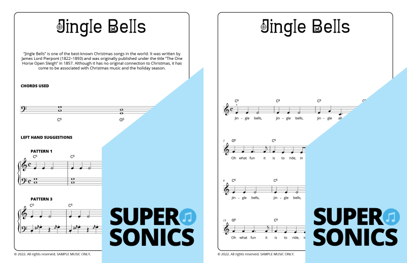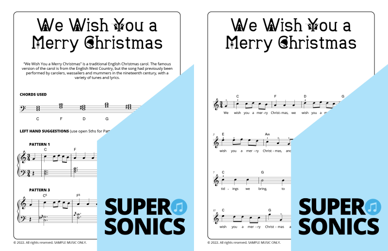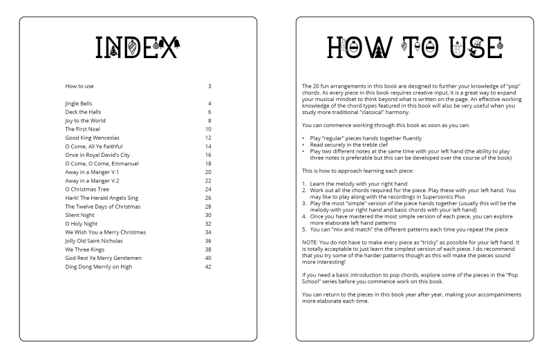Explore 20 traditional Christmas carols done the Supersonics way in this fun collection. Make Christmas this year super easy by presenting your students with a range of “quick win” favourites. The carols have been re-harmonized in a contemporary style, making them sound upbeat and relevant. Each piece has multiple different accompaniment levels meaning that you can cater for a wide range of student abilities. The chords and keys used are accessible and easy to get your head around. Not overly experienced with teaching from lead sheets? Don’t worry, every piece has detailed instructions meaning that you and your students get to just relax and enjoy the experience!