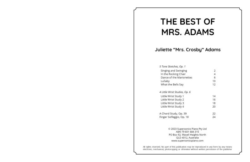 Juliette Adams (1858-1951), known as Mrs. Crosby Adams, was an American pianist and piano teacher. From the age of 7, she studied piano with local teachers and later trained under notable instructors such as Cecelia Cary, Claude Crittenden, and Henri Abby. She taught piano at Ingham University in LeRoy, New York, from 1879 to 1883, and maintained private studios in Buffalo, Kansas City, and Chicago. Juliette and her husband, Crosby Adams, were influential music educators at the Montreat Normal School, organizing Summer Festivals. Despite their age, both continued teaching until the age of 92.
