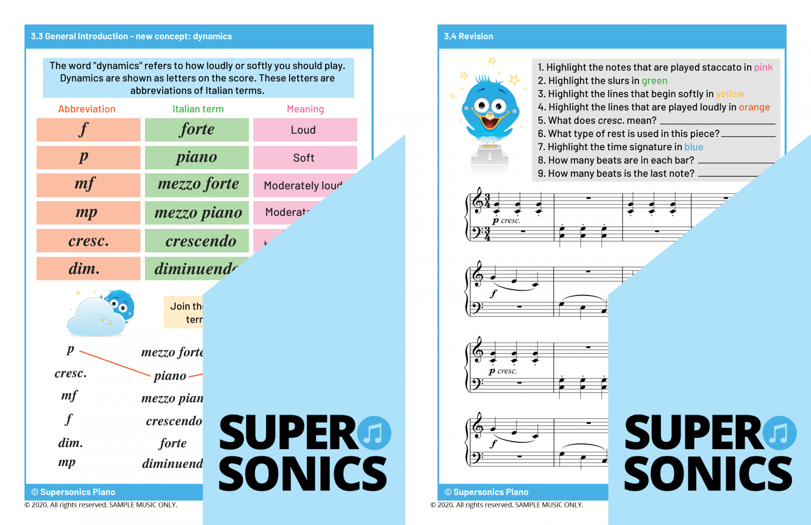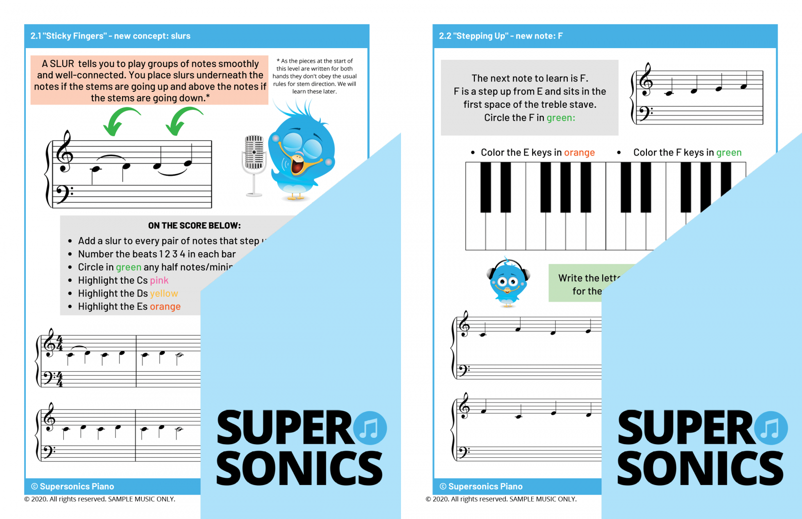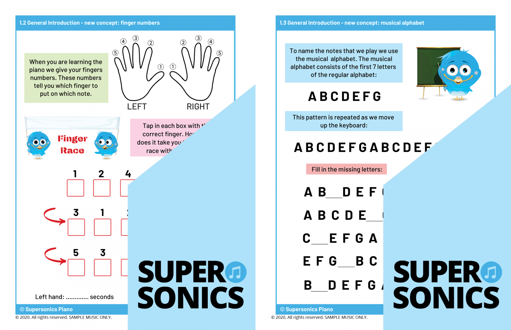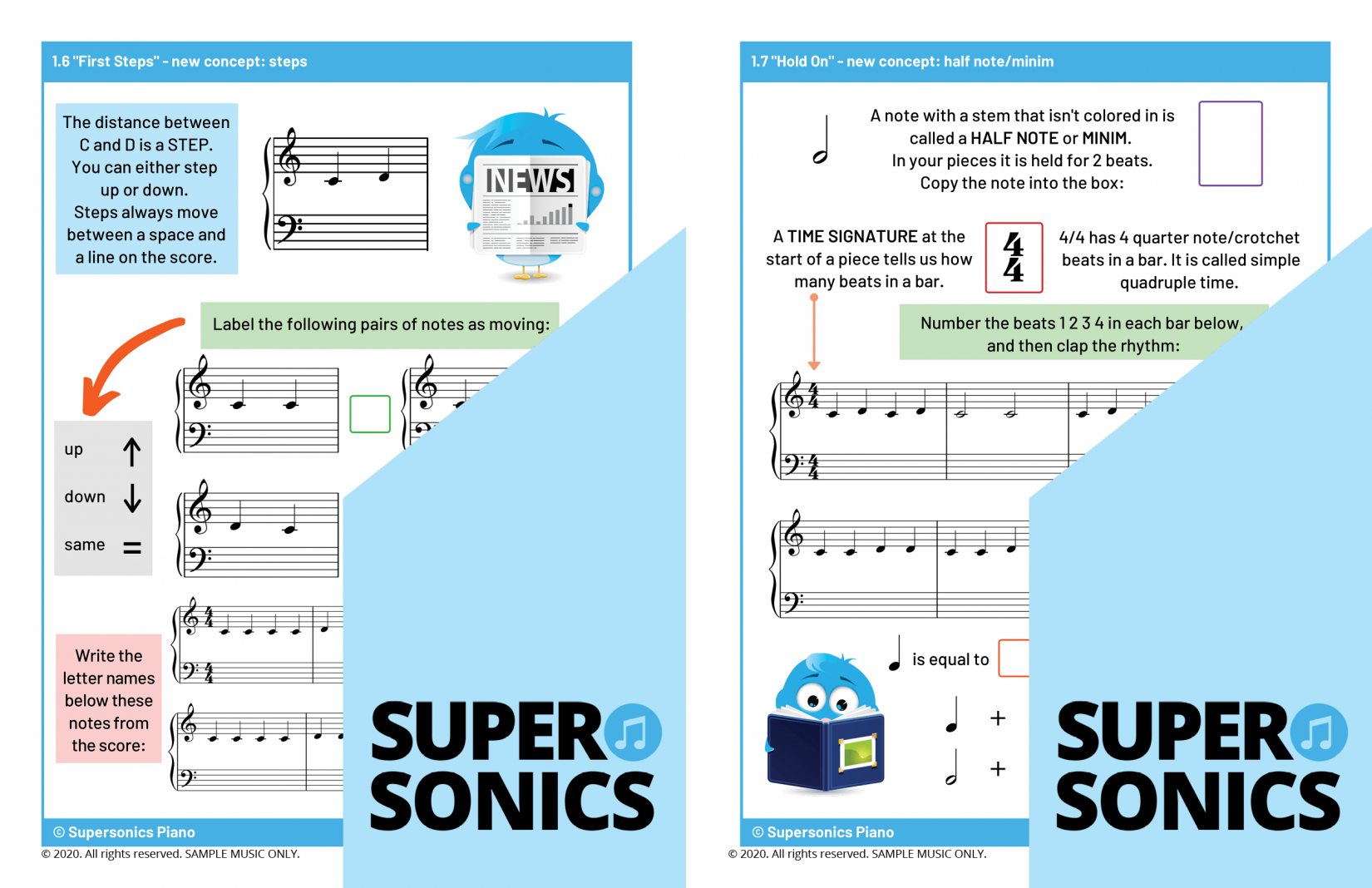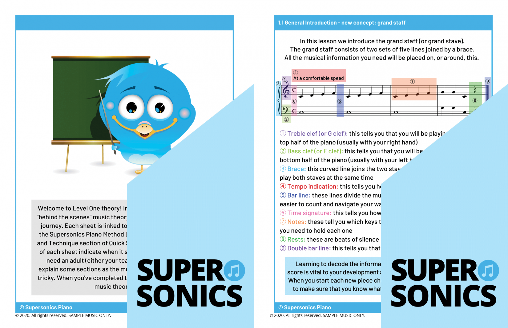 - Content: This 48 page beginner theory book pairs with Level 1 of the Supersonics Piano Method, the Supersonics Piano Method Junior series and the Reading and Technique section in Quick Start A and gives students all the foundational knowledge they need to start their musical journey.