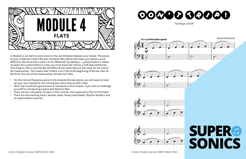 This Module introduces flats and features several pieces that require a greater degree of coordination between the hands. Use this Module to make sure that the student’s technique is rock solid. The audio samples feature the teacher duets. Listen to the free backing tracks and view the online support material