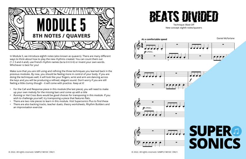 - Teaching Support via our Facebook Group: Join our Supersonics Piano Facebook Group to join a lively community of piano tutors using our method.