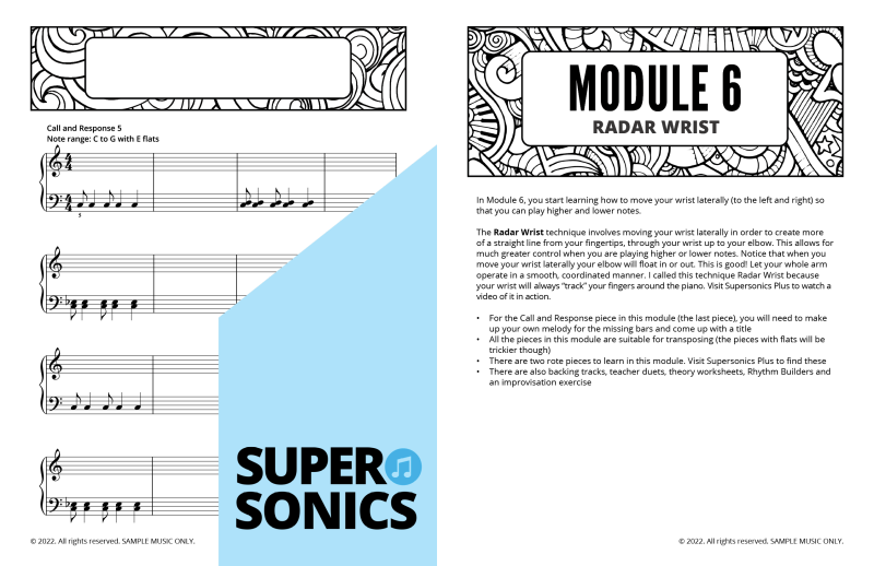 Module 6 introduces the Radar Wrist technique (for longer phrases and lateral wrist and arm movement) and expands the note-reading range outwards. The audio samples feature the teacher duets. Listen to the free backing tracks and view the online support material