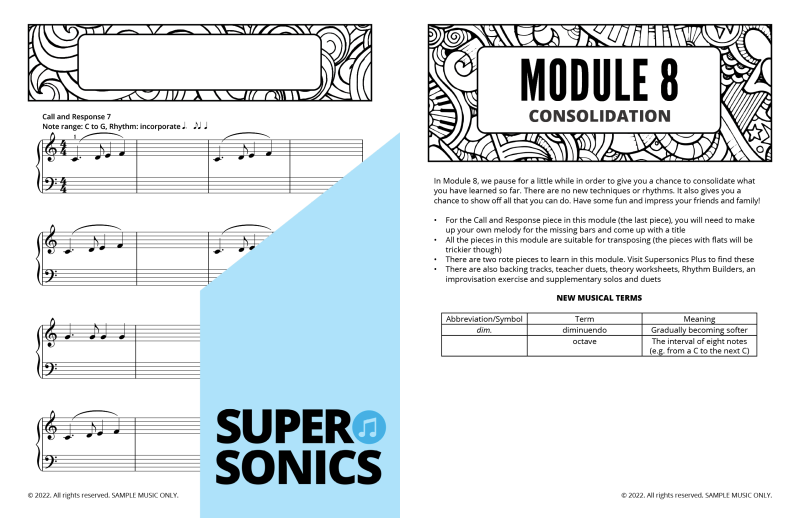 Module 8 features pieces that are great fun to play and make excellent concert pieces. It’s a chance for students to consolidate and really enjoy their playing. The audio samples feature the teacher duets (where available). Listen to the free backing tracks and view the online support material