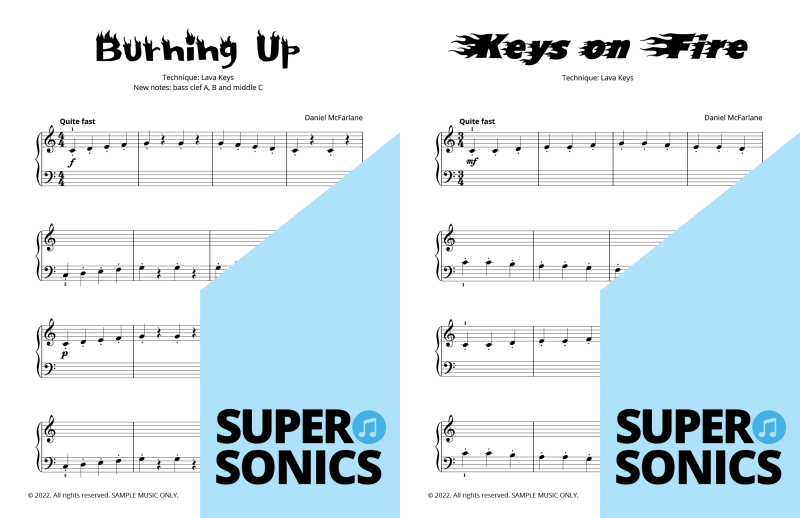 This Module introduces the Lava Keys technique (for finger staccato). Check for strong finger joints and a crisp staccato touch. The left hand note reading now expands upwards to incorporate Middle C. The audio samples feature the solo recordings. Listen to the free backing tracks and view the online support material