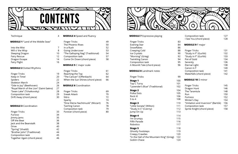 - Each module is targeted towards a particular concept, note-reading range or rhythm, making it easy to understand and to integrate extra material.