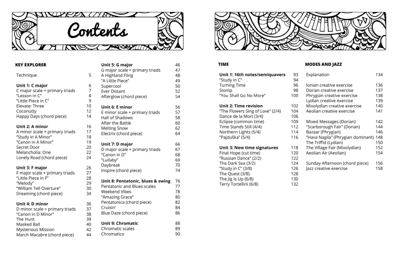 Level 3 also introduces modes — including Dorian, Phrygian, Lydian, Mixolydian, Aeolian, and Phrygian dominant — supported by creative activities that help students hear and understand how these sounds work in practice. Chord work continues throughout the level, and units typically begin with a simple exercise or easier piece before moving into the main repertoire and concluding with chord-based or creative work.