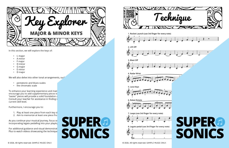 Supersonics Piano Method Level 3 is designed to help students explore the many musical possibilities that open up at this stage of learning. Building on the note-reading range, confidence, and technique developed in Level 2, Level 3 becomes a launching point for discovering new types of music — and using those experiences as jumping-off points for further exploration.