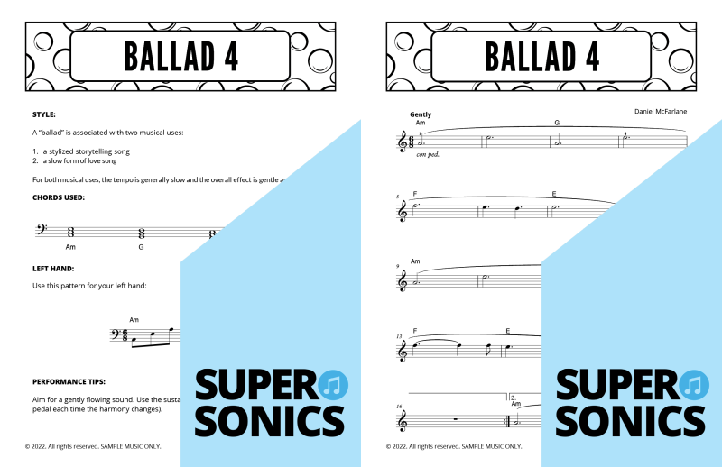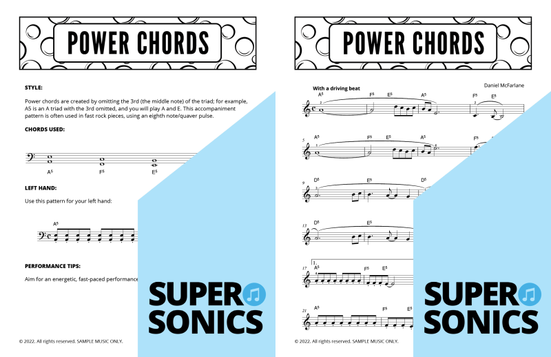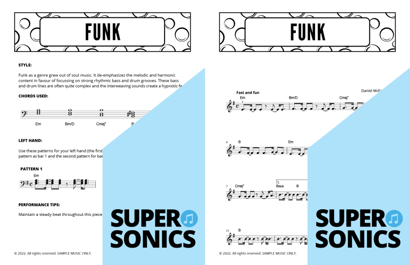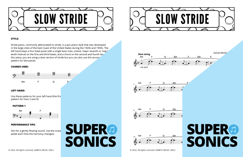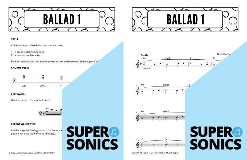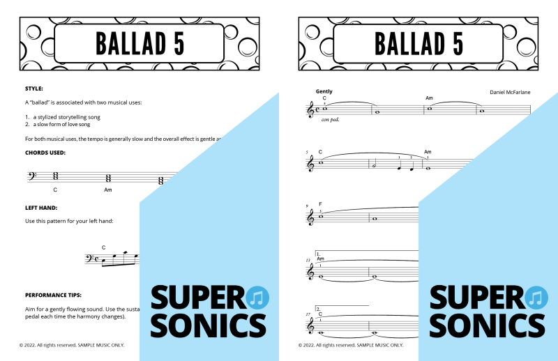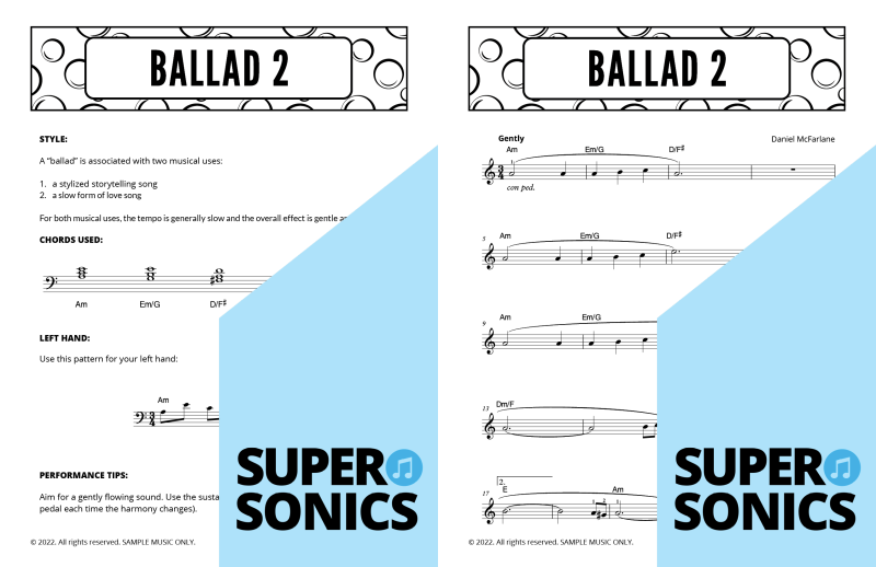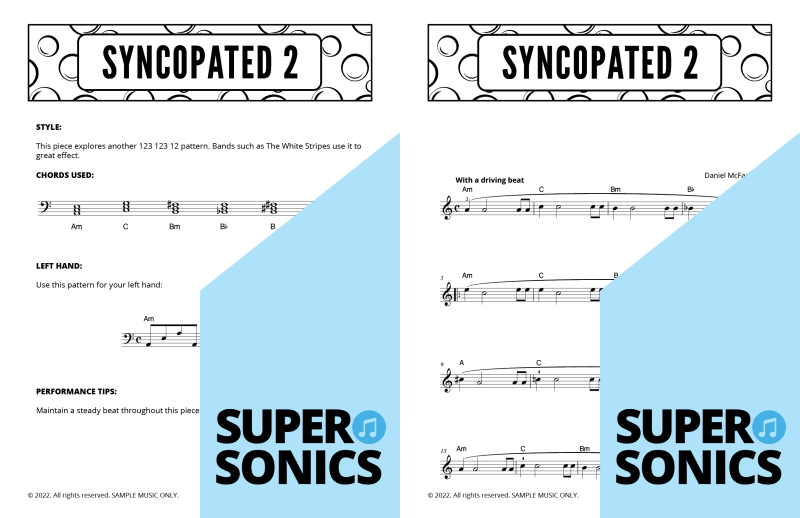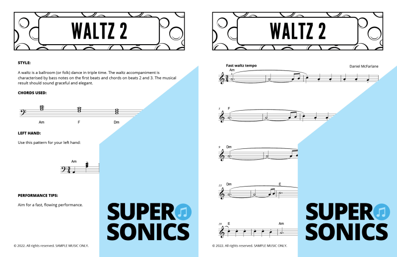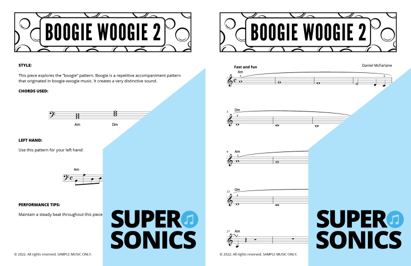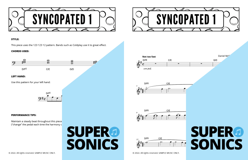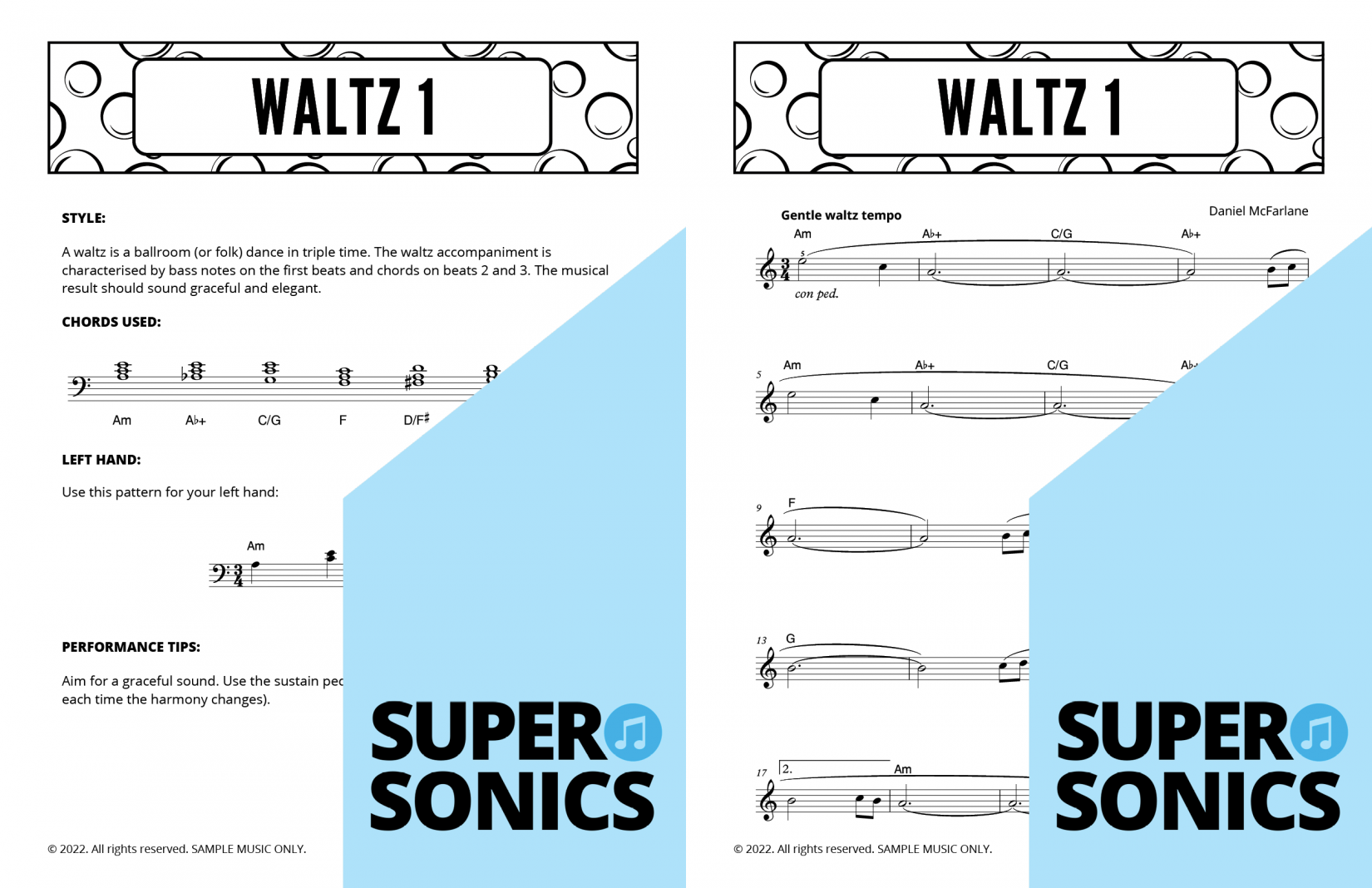 Pop School 2 is the perfect companion to more “traditional” piano methods (If you are already using Supersonics Piano Method Levels 4 and 5 then you are already covering the concepts and material within this book). Each original piece introduces or consolidates a new accompaniment style. The free Roman Numeral and Nashville Number System analyses in Supersonics Plus will help further your understanding of each piece.