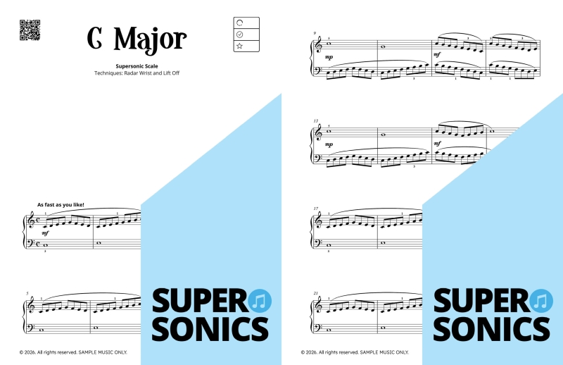 Quick Start B is an accelerated piano method for older beginning and continuing students working at Mid Elementary to Late Elementary (approximately Grade 1) level. It reorganises and adapts the material from Supersonics Piano Method Level 3 into a faster, more clearly articulated learning pathway suited to teens, adults, and students who progress quickly.
